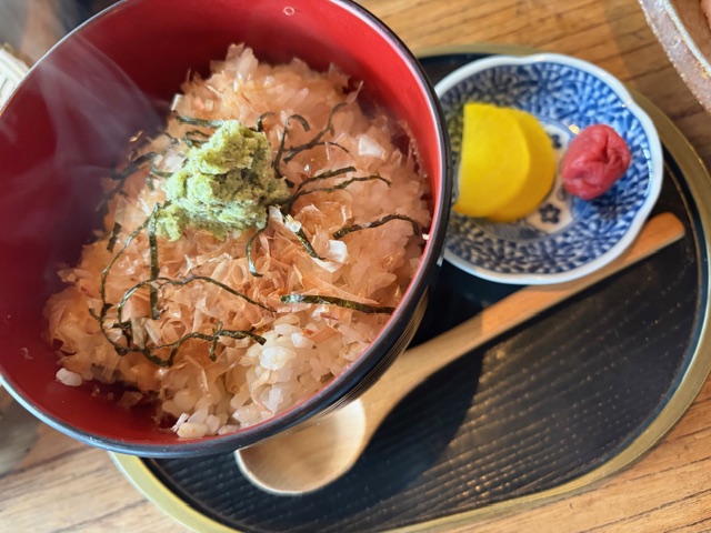 静岡県・伊豆の名物料理で、炊きたてご飯に削りたての鰹節と生おろしわさび、そこにお醤油をかけていただきます。